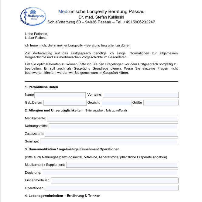Optimal ist es, wenn mir der Bogen einige Tage vor dem Erstgespräch vorliegt, damit ich mich in Ihre Daten einarbeiten kann.